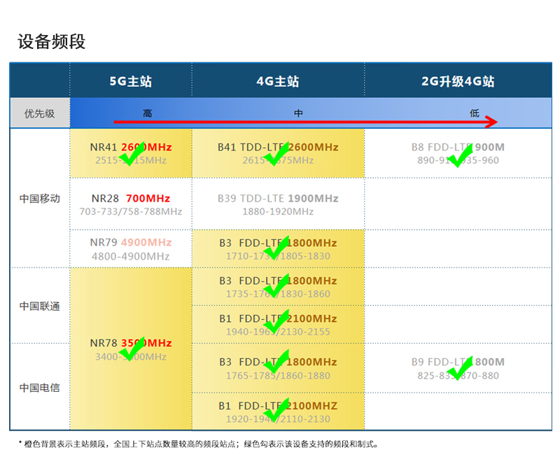 其中2600M為2515-2675MHz全頻160MHz帶寬,包含中國移動(dòng)的5G的NR100MHz和4G的LTE60MHz