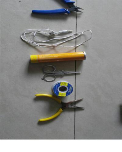 第一步:準備好材料——尖嘴鉗,剪刀,鋁管,耳機線,鐵絲鉗,鐵絲(可用焊錫絲代替)。