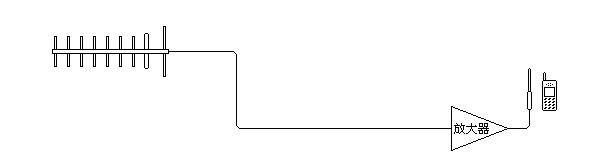 但是,上述只是一種比較極端的情況,更多的場(chǎng)合是沒(méi)有這么好的條件的,往往需要在十米二十米以外才能找到強(qiáng)信號(hào),這時(shí),用這種簡(jiǎn)單的方法就不能奏效了。因?yàn)樵冢梗埃埃停龋l段,電纜的損耗是比較大的,而小天線(xiàn)與手機(jī)之間的信號(hào)傳輸也有不小的衰減量,這樣高增益天線(xiàn)和手機(jī)之間無(wú)法實(shí)現(xiàn)有效地傳輸,當(dāng)然也就無(wú)法通信了。解決的辦法是在傳輸途徑中插入放大器來(lái)彌補(bǔ)傳輸損耗,如下圖所示。